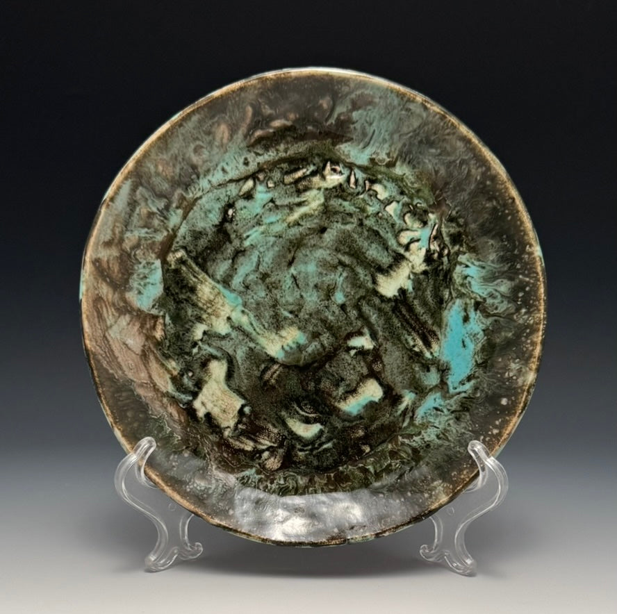 Multicolor aqua and brown dessert/salad plates; $28, 8.25"d x 1"h. Food, dishwasher and microwave safe. 2 available